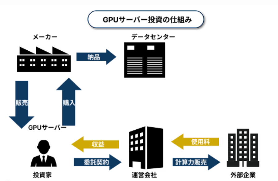 GPUサーバー投資とは、高性能GPU搭載サーバーをAI企業や研究機関に貸し出して収益を得る投資スキームです。