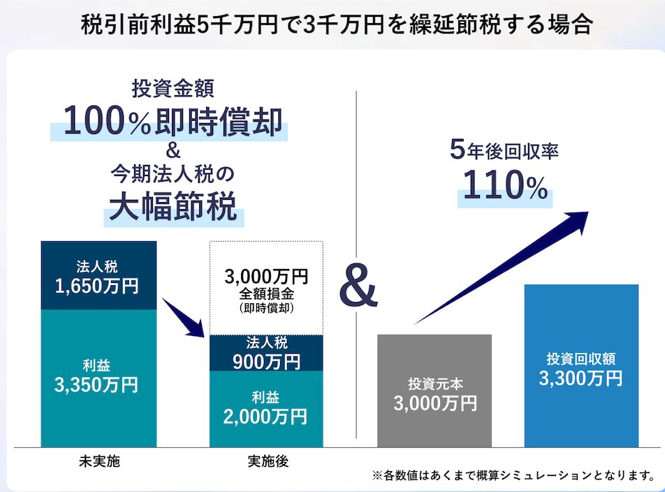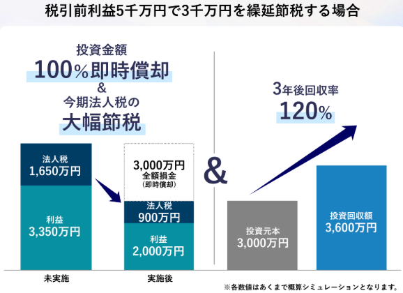 少額減価償却資産(10万円未満)を利用した初年度100%即時償却により法人税を圧縮し、3年間で110%の投資回収率を実現する節税スキームです。