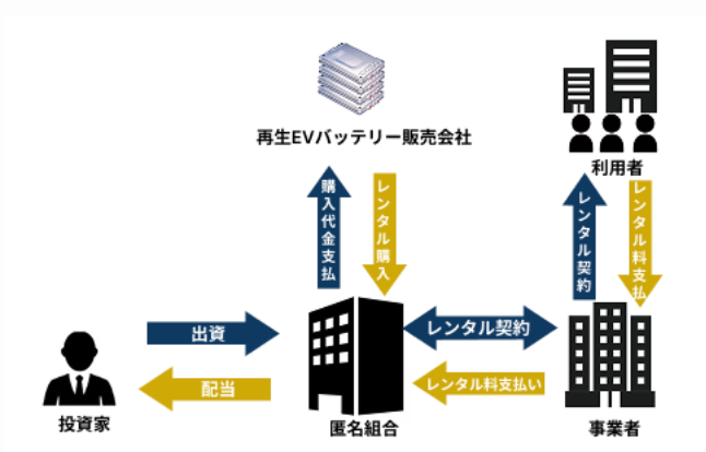 再生EVバッテリー事業投資とは、使用済みEVバッテリーをリフレッシュして非常用電源やオフグリッド街路灯として活用する事業に匿名組合を通じて出資する仕組みです。