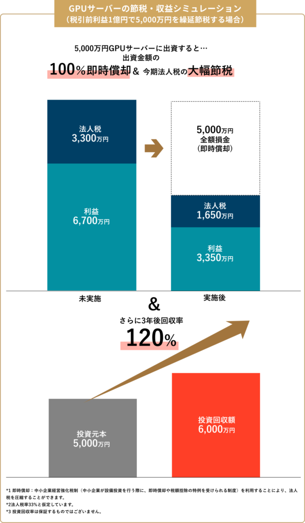 中小企業経営強化税制の活用により初年度100%即時償却が可能で、高収益を狙える次世代インフラ投資として注目されています。なお、弊社がご案内するGPUサーバー投資なら、3年間で120%の投資回収率が期待できます。