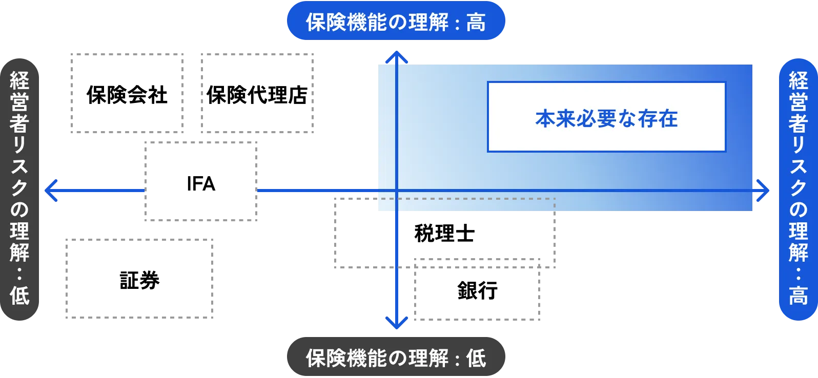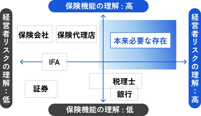 このマトリクスで整理すると、例えば「死亡」よりも「就業不能」の方が発生頻度は高く、かつ事業への大きさにも関わらず、ここに備えておる経営者は意外と少ないのが現状です。